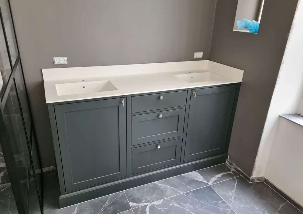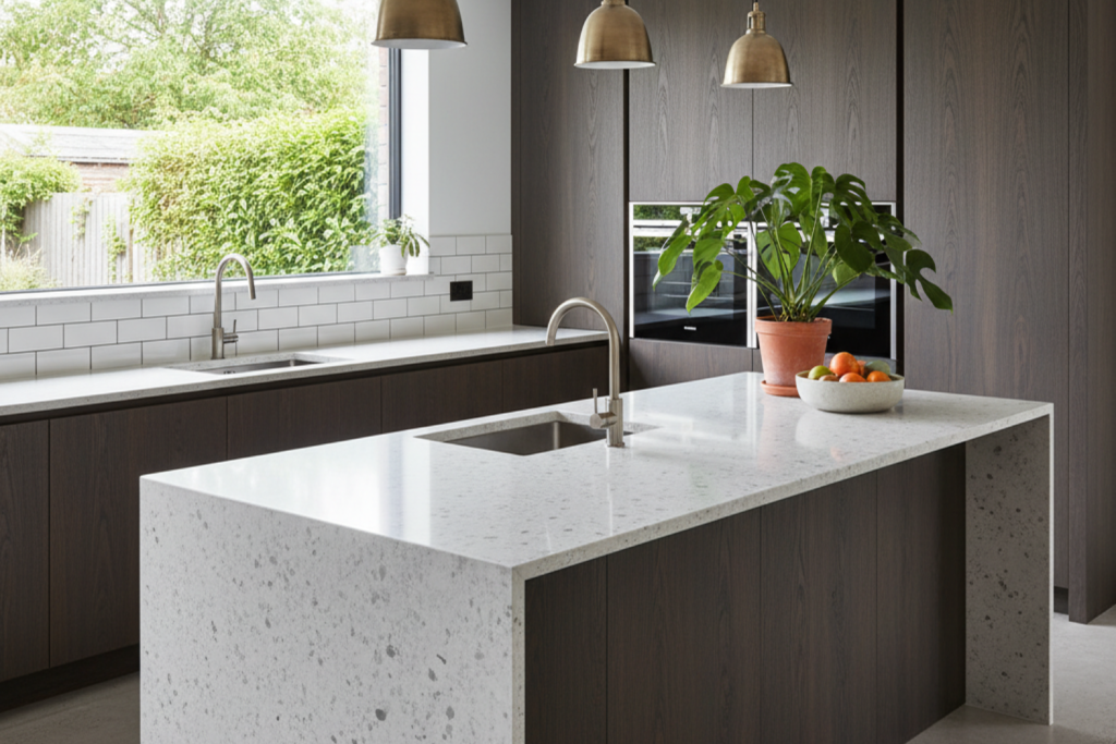 De består af naturlige mineraler og harpiks, som sammen danner en kompakt, slidstærk og ensartet overflade – perfekt til både køkkener og badeværelser.
